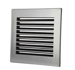 Lüftungsgitter aus Stahlblech, zur Verbrennungsluftversorgung; mit einer optisch ansprechenden Blende aus geschliffenem Edelstahl; einfache Montage durch praktischen Einbaurahmen.