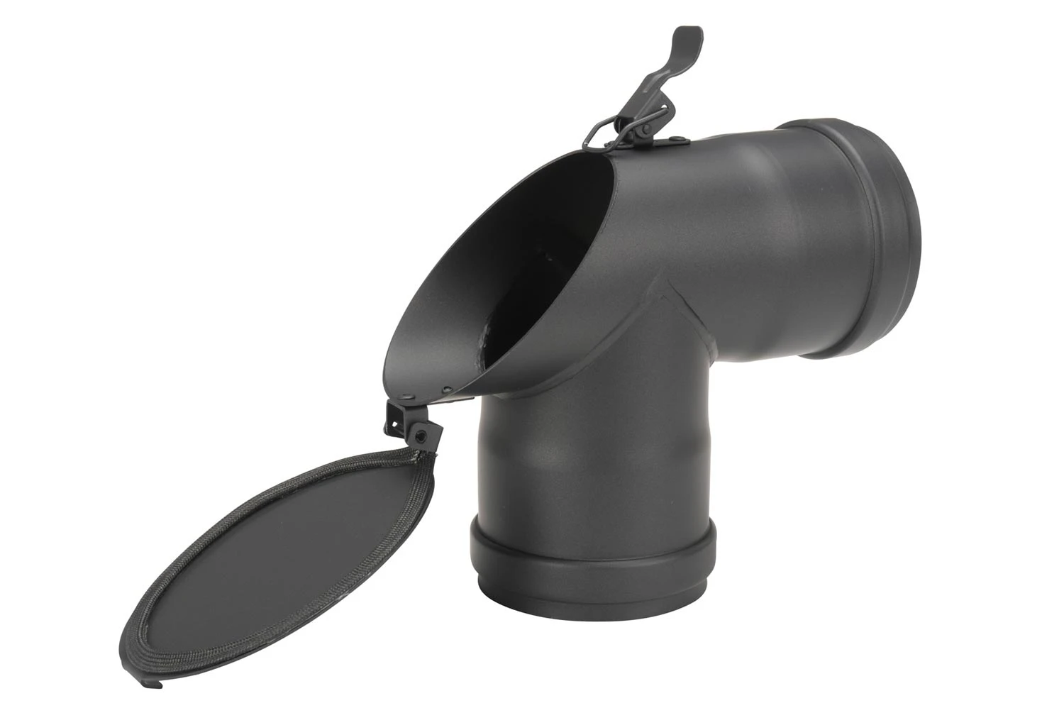 Pelletrohr T-Stück mit innenliegenden Dichtungen und hitzebeständiger Lackierung in wählbaren Querschnitten 80 mm oder 100 mm in schwarz speziell für den Anschluss von Pelletöfen- und kesseln an Schornsteine.