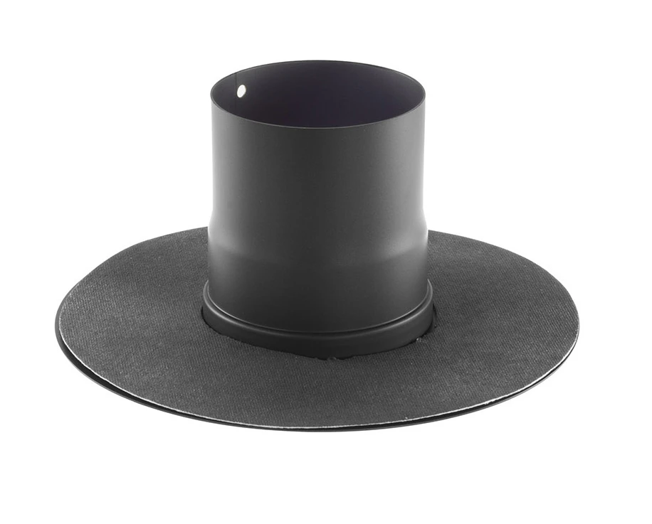 Ofenrohr Wandrosette aus Stahl und hitzebeständiger Lackierung zum Abdecken von Pelletofenanschlüssen an Schornsteine.