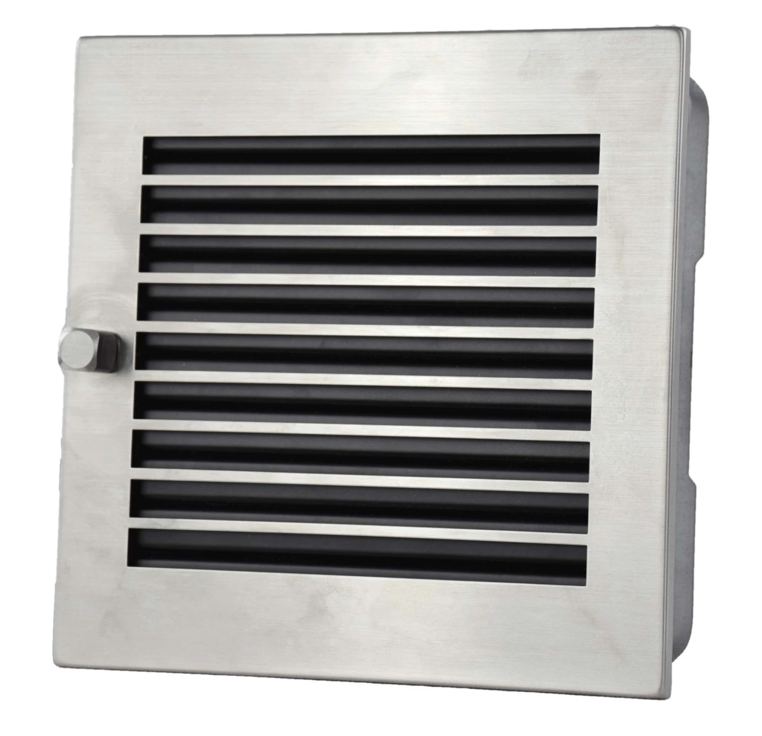 Lüftungsgitter aus Stahlblech für Ihren Kamin zur Regulierung der Konvektionswärme; mit einer optisch ansprechenden Blende aus geschliffenem Edelstahl; einfache Montage durch praktischen Einbaurahmen.